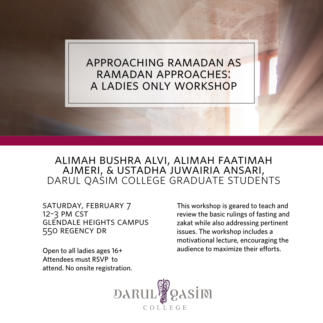 As Ramadan draws near, take time to prepare your heart, mind, and actions for the most blessed month of the year. Join us for an impactful ladies-only workshop designed to help you enter Ramadan with confidence, clarity, and motivation.