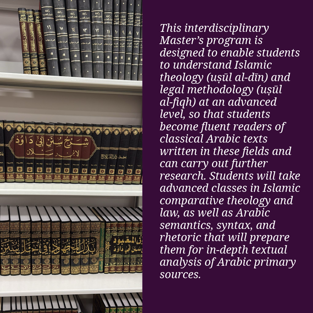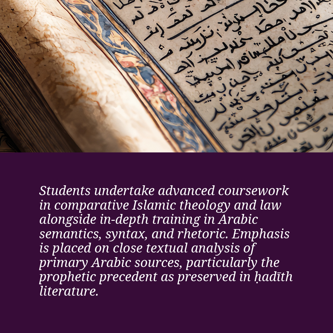 Advance your scholarship and service. This interdisciplinary Master’s program equips students with advanced training in uṣūl al-dīn and uṣūl al-fiqh, deep fluency in classical Arabic, and rigorous research methodology, preparing graduates to engage primary sources, address contemporary challenges, and lead with clarity and confidence. Join a curriculum that bridges foundations (uṣūl) and application (furūʿ), equipping scholars, educators, and community leaders with the Islamic Knowledge to serve today’s diverse Muslim community.